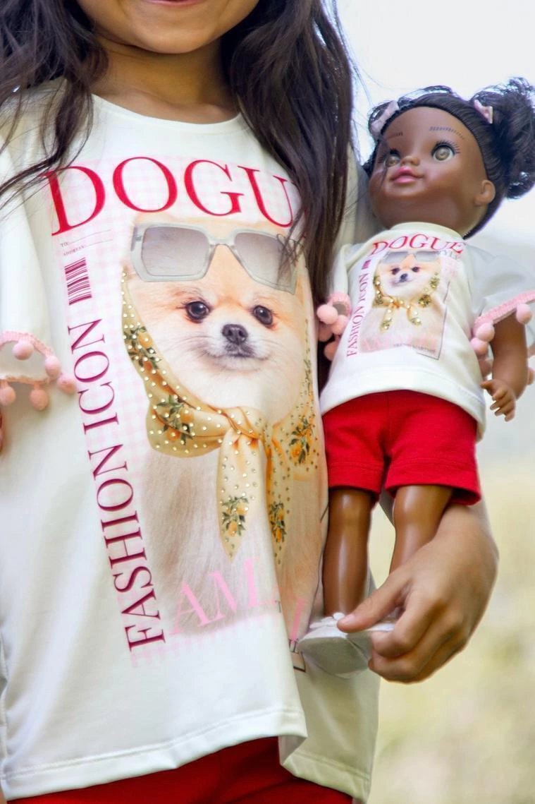 Conjunto infantil composto por camiseta branca com estampa de cachorrinho, destaque para o strass aplicado. A camiseta possui mangas com acabamento em pompons rosa, combinando com bermuda ciclista vermelha que garante conforto e liberdade nos movimentos. Acompanha versão idêntica para a boneca, proporcionando combinação perfeita e divertida no look. Ideal para passeios, momentos de lazer e produções cheias de estilo.
